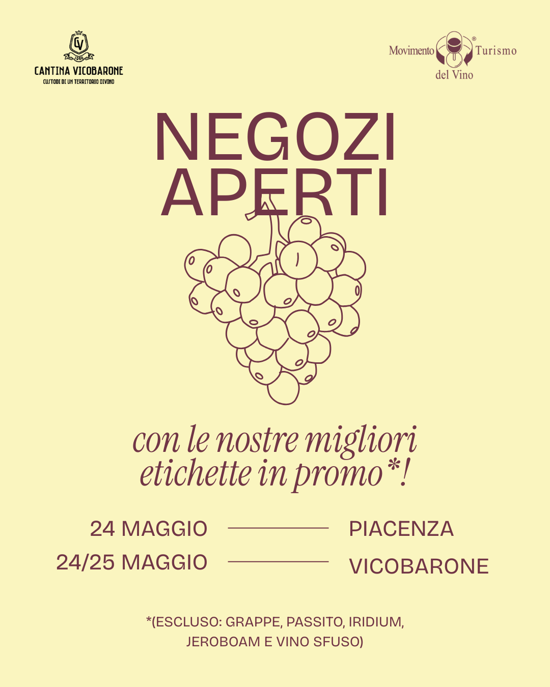 Durante l’evento, nei nostri punti vendita di Vicobarone e Piacenza, troverai offerte* speciali riservate a chi ama portare a casa il vino con cui ha brindato.