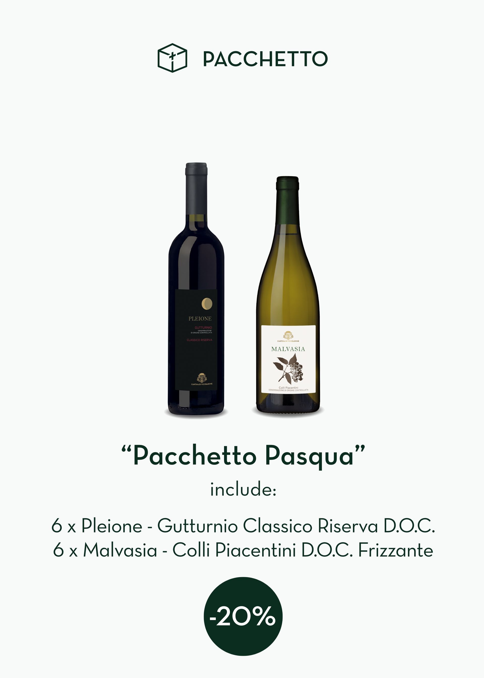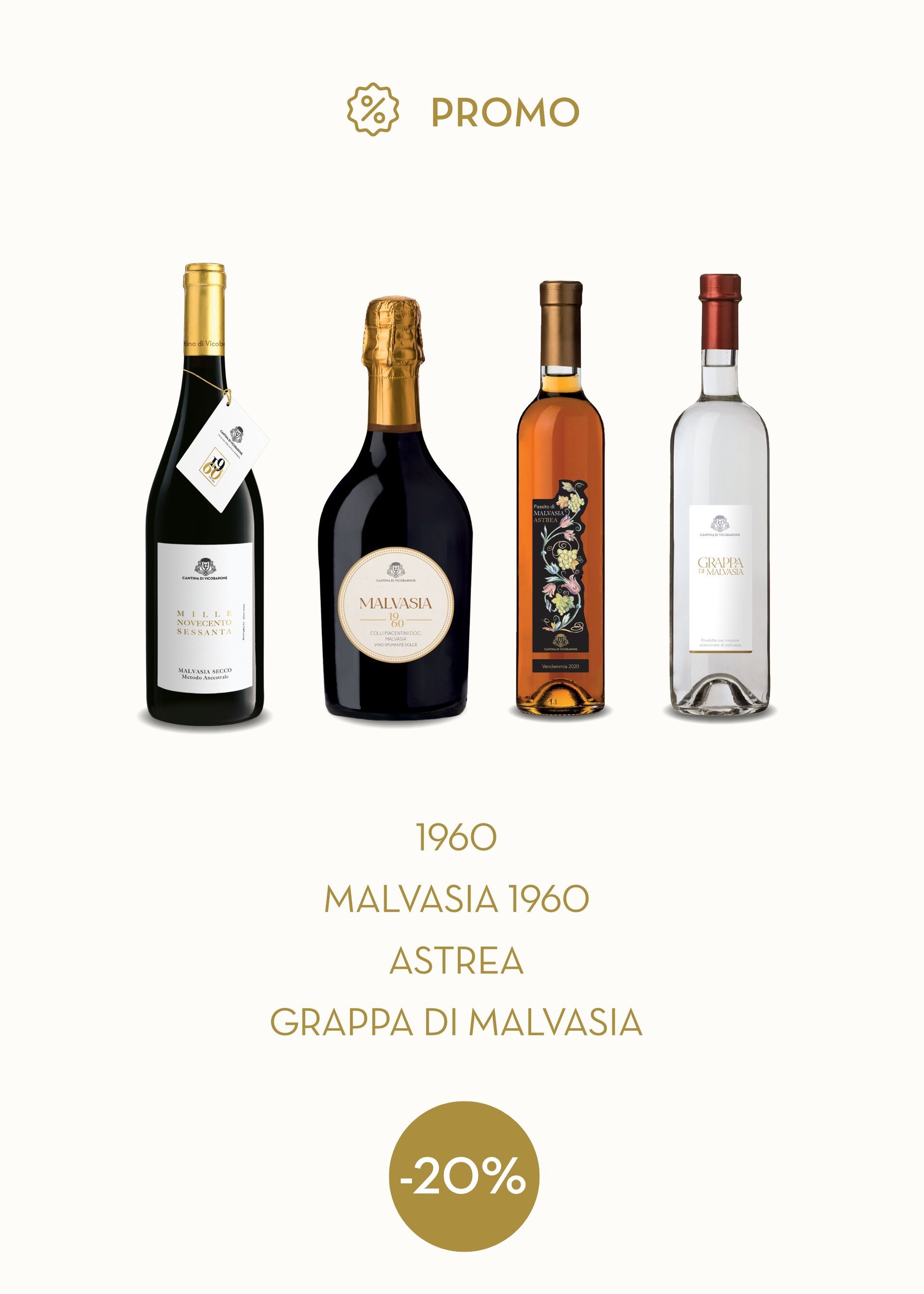 Dal 29 marzo all'8 aprile, nei nostri Punti Vendita, approfitta del 20% di sconto su Malvasia Ancestrale 1960, Spumante Dolce Malvasia 1960, Passito Astrea, Grappa di Malvasia e sul nuovo Pacchetto Pasqua che comprende Gutturnio DOC Classico Riserva e Malvasia Sostenibile certificata V.I.V.A.!
