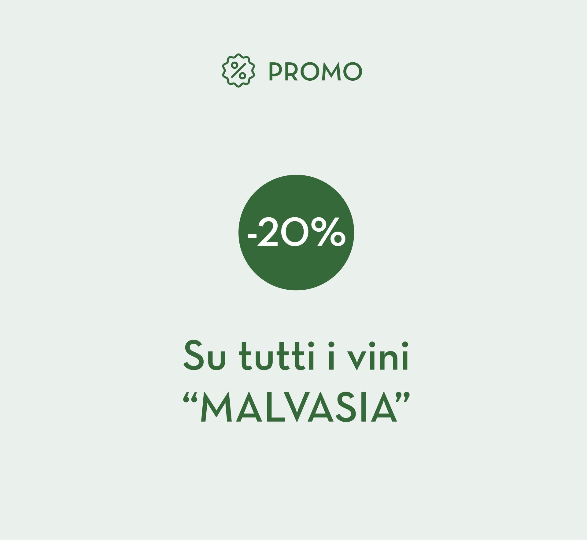 Per tutto il mese, nei nostri punti vendita potrai approfittare dello sconto del 20% su tutte le proposte di Malvasia e sul nostro Spumante Brut Metodo Classico, anche in versione Magnum.